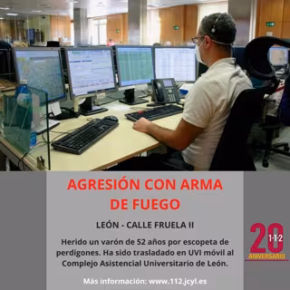Una vez allí, la Policía Local de León solicitó asistencia sanitaria para un varón que presentaba una herida por escopeta de perdigones en el abdomen, por lo que se avisa a Emergencias Sanitarias-Sacyl, que movilizó una UVI móvil. La víctima, un varón de 52 años, fue atendida por el personal sanitario, y posteriormente trasladada en Unidad Medicalizada de Emergencias al Complejo Asistencial Universitario de León.