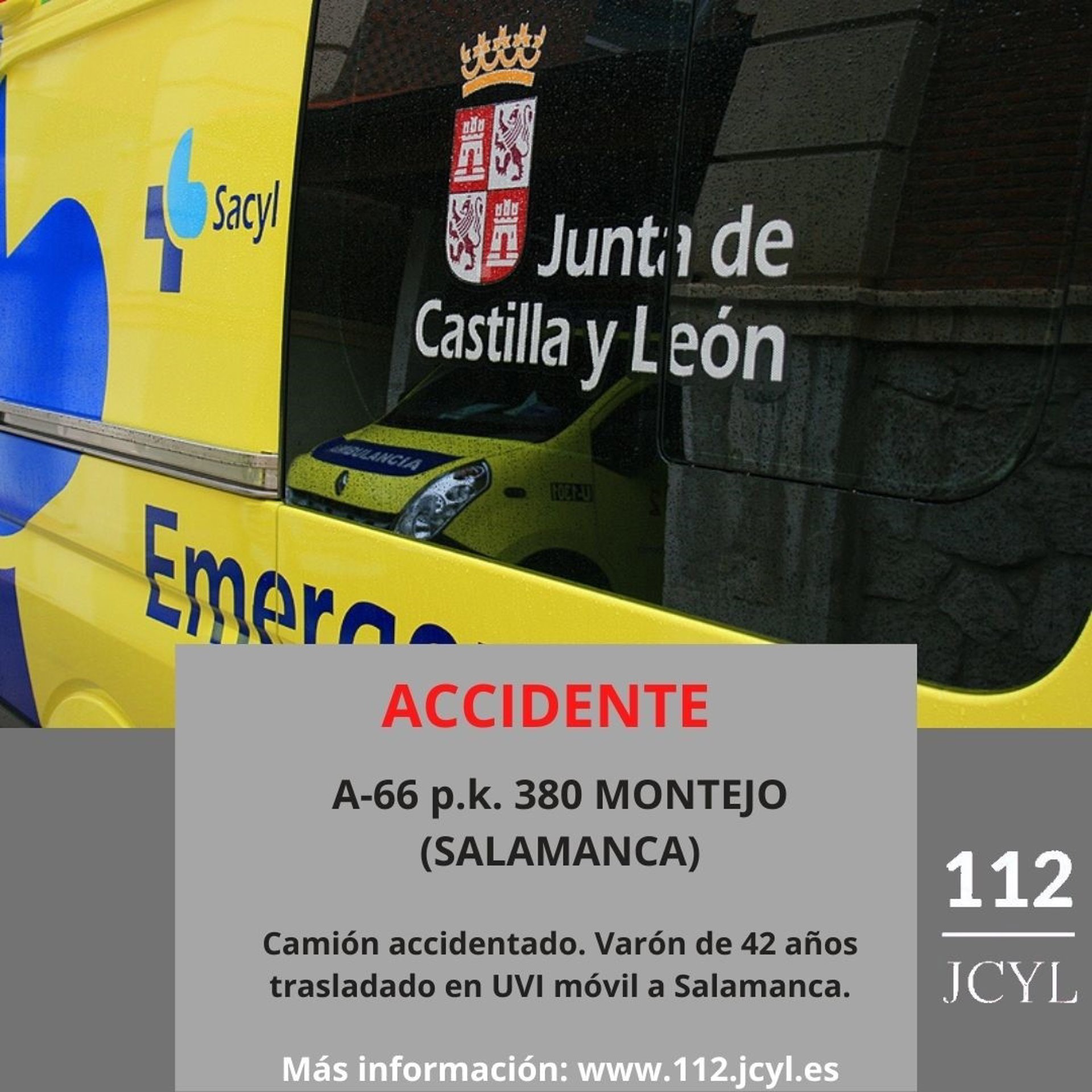 Un varón de 42 años ha tenido que ser trasladado al Complejo Asistencial de Salamanca tras resultar herido en un accidente de circulación registrado esta noche en la A-66 a la altura del término salmantino de Montejo, según los datos que aporta el Servicio de Emergencias de Castilla y León 112 y recoge Europa Press.