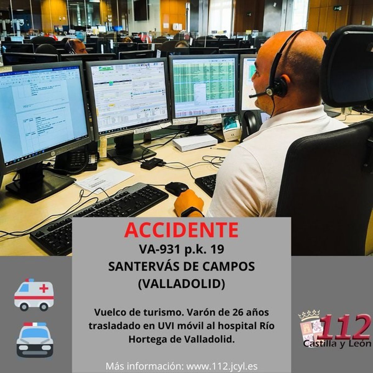 La sala de operaciones del 1-1-2 dio aviso de este incidente a la Guardia Civil (Tráfico) de Valladolid, y al centro coordinador de urgencias (CCU) de Emergencias Sanitarias-Sacyl, que movilizó una ambulancia soporte vital básico, una Unidad Medicalizada de Emergencias, y al equipo médico del Centro de Salud de Villalón de Campos.