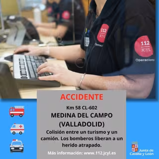 El accidente ha tenido lugar alrededor de las 10.11 horas de este miércoles cuando se informó al 112 sobre una colisión entre un vehículo y un camión en el kilómetro 58 de la CL-602 en Medina del Campo con el resultado de una persona atrapada en el turismo.