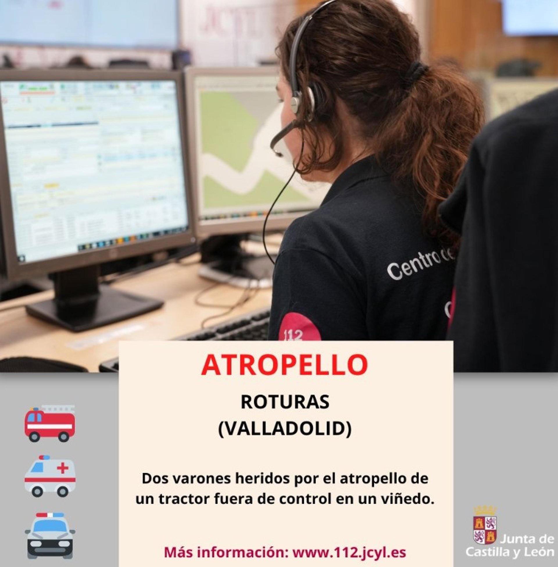 El siniestro se ha producido minutos antes de las 13.52 horas de este martes, cuando una llamada ha solicitado a la sala de operaciones del 112 Castilla y León asistencia para dos varones que habían resultado heridos al ser atropellados por un tractor en un viñedo entre las localidades de Pesquera y Roturas (Valladolid).
