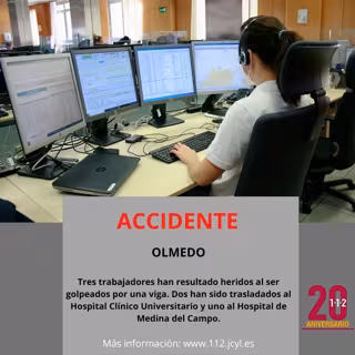 Los hechos han ocurrido alrededor de las 09.54 horas de este lunes, 23 de enero, cuando se informó al 112 de un accidente junto al kilómetro 33 de la VA-405, en Olmedo, donde tres trabajadores habían resultado heridos al ser golpeados por una viga.