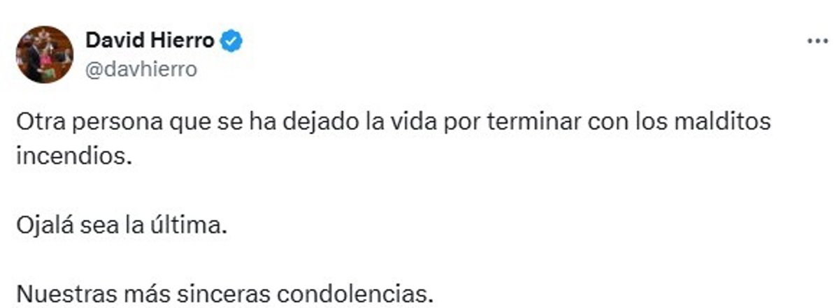 "Otra persona que se ha dejado la vida por terminar con los malditos incendios", ha señalado el portavoz parlamentario en un un mensaje publicado en su perfil de la red social 'X' (@davhierro) recogido por Europa Press.