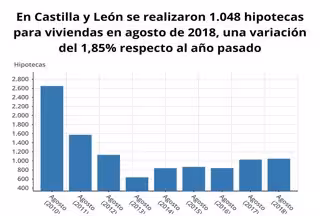 El número de hipotecas constituidas sobre viviendas en Castilla y León se situó en 1.048 en el mes de agosto, lo que supone un aumento del 1,8 por ciento (5,8 por ciento en España) con respecto al mismo mes de 2017, según los datos difundidos este miércoles por el Instituto Nacional de Estadística (INE) y recogidos por Europa Press.