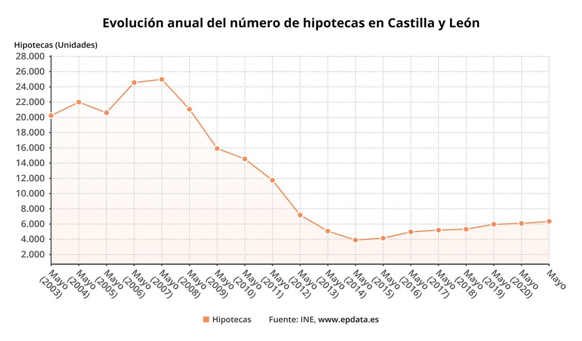 El número de hipotecas constituidas sobre viviendas en Castilla y León se situó en 1.363 en el mes de mayo de 2021 y aumentó un 51,1 por ciento en comparación con el mismo mes del año anterior, superior al incremento en España (37,4 por ciento), según los datos difundidos este lunes por el Instituto Nacional de Estadística (INE) y recogidos por Europa Press.
