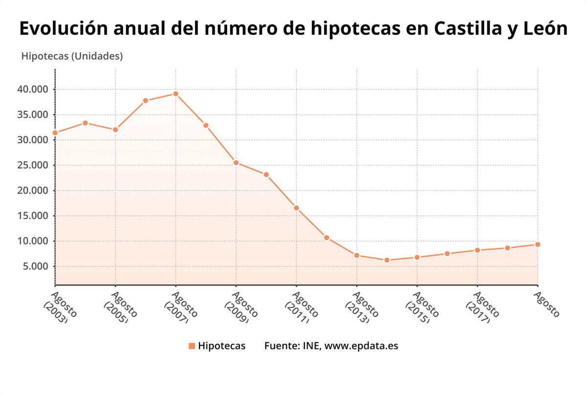 El número de hipotecas constituidas sobre viviendas en Castilla y León se situó en 781 en el mes de agosto y cayó un 28,1 por ciento frente a un descenso del 29,9 por ciento en España, según los datos difundidos este martes por el Instituto Nacional de Estadística (INE) y recogidos por Europa Press.