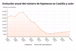 En total y según los datos aportados por el INE, los ciudadanos de Castilla y León hipotecaron durante agosto 1.146 fincas, tanto rústicas como urbanas, por valor de 126,08 millones de euros. En concreto, se hipotecaron 1.076 fincas urbanas por un valor de 115,86 millones de euros y se constituyeron 70 hipotecas de fincas rústicas por 10,21 millones de euros.