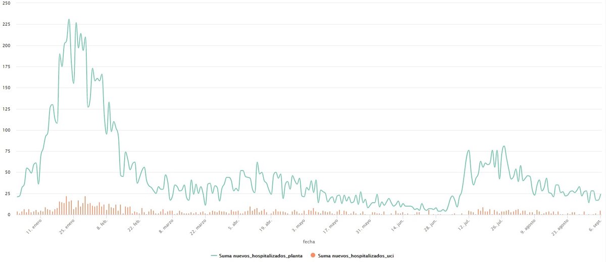 En el caso de las plantas, la cifra de estos últimos tres días suma 58 nuevos ingresos, lo que supone un 29 por ciento que el dato recogido entre el 28 y el 30 de agosto (82). El máximo en esta 'quinta ola' se dio en los días 24, 25 y 26 de julio, con 190 pacientes en las plantas, tres veces más que los del último fin de semana.