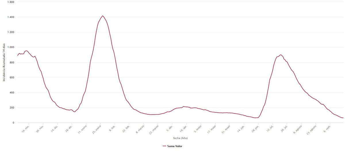 La incidencia acumulada del COVID-19 en los últimos 14 días en Castilla y León se sitúa este lunes en 62,6 casos por cada 100.000 habitantes, ya por debajo de las cifras previas a la 'quinta ola' --63,6 el pasado 25 de junio-- y, por lo tanto, en el mínimo desde que la Junta ofrece información de este indicador diariamente en su web de Datos Abiertos --5 de noviembre de 2020--.