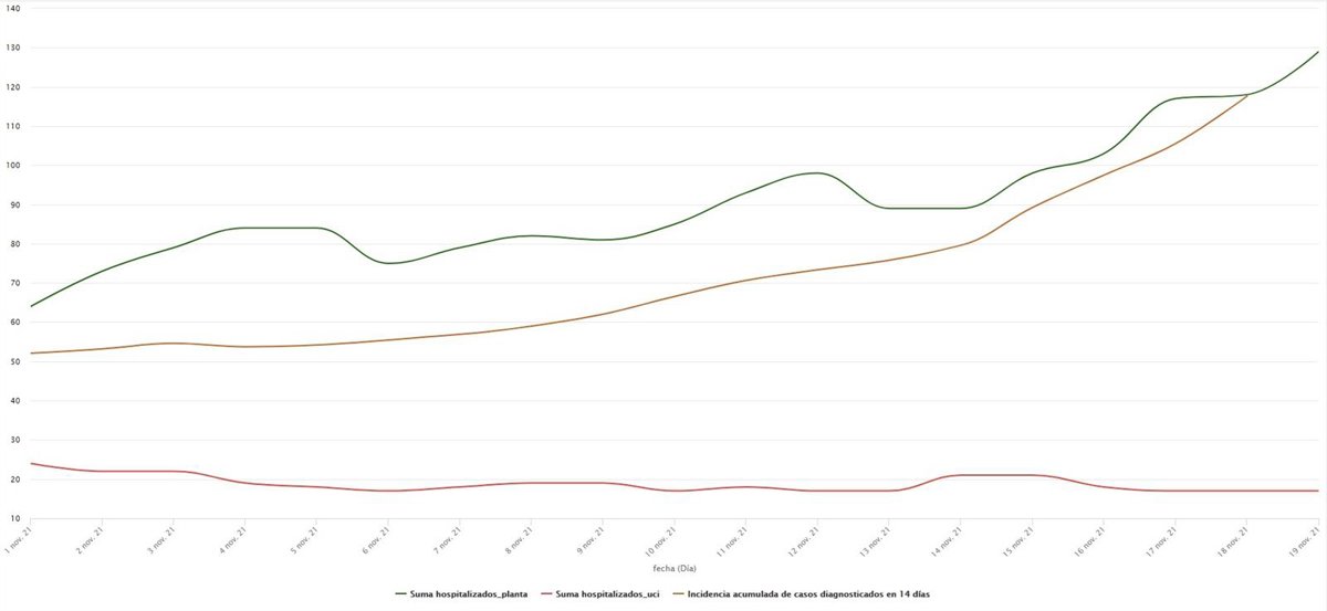 Evolución de valores de incidencia acumulada a 14 días y ocupación hospitalaria en el mes de noviembre de 2021 en CyL. - JCYL