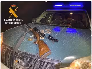 Procedieron a la inspección del vehículo y pudieron observar cómo en el hueco de los asientos traseros había una funda de arma abierta, con un rifle en su interior listo para su uso, municionado con una bala en la recámara y tres balas en el cargador, así como una mira telescópica y un trípode, todo ello propio de la actividad de caza mayor.