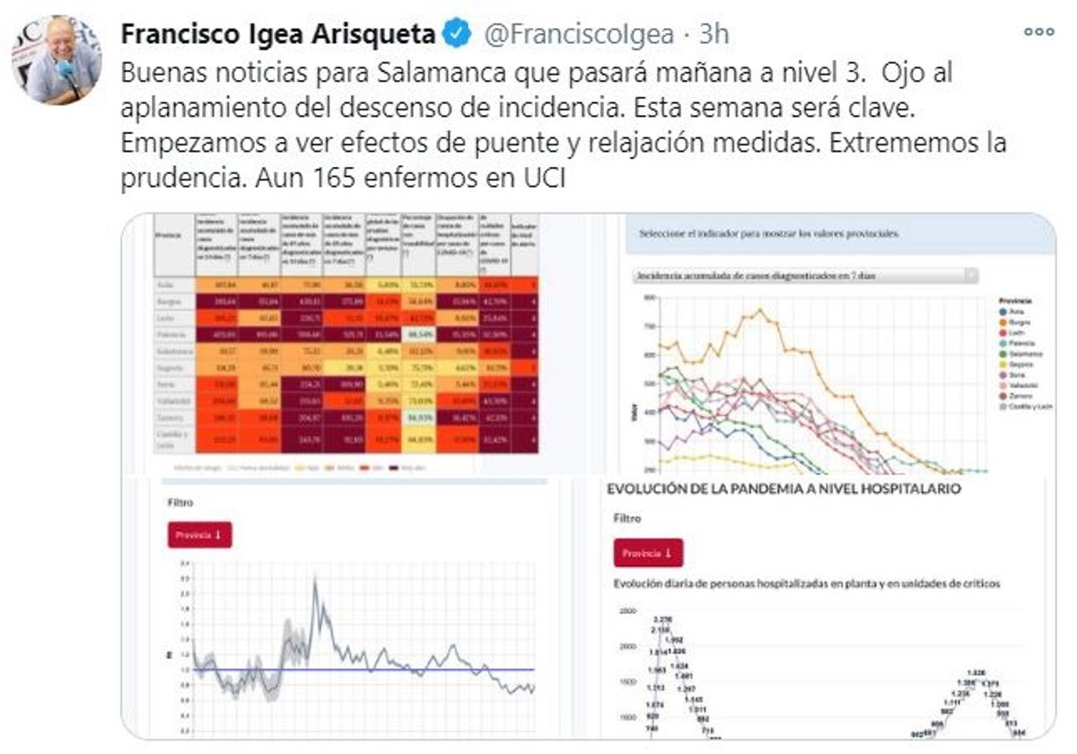 Así lo ha señalado el vicepresidente en un tuit que ha publicado en la tarde de este lunes en el que además de destacar que la provincia de Salamanca pasará este martes a nivel 3 de acuerdo con el denominado Semáforo COVID, advierte de esa desaceleración en el descenso de la incidencia acumulada en los últimos días.