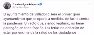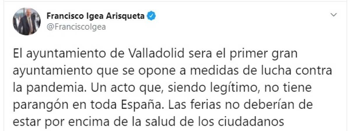 Igea, en un tuit recogido por Europa Press, se ha expresado así tras conocer que el Ayuntamiento de Valladolid recurrirá las medidas impuestas tanto a la ciudad del Pisuerga como a Salamanca, por "falta de justificación", "incoherencia" y el perjuicio que causarán a empresas y personas contratadas para eventos a celebrarse en próximas fechas.