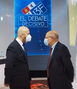 El director general de Radio Televisión de Castilla y León, Jorge Losada (i), y el candidato de Ciudadanos a la Presidencia de la Junta, Francisco Igea (d), conversan a su llegada al Debate decisivo, en CyLTV. - Europa Press/Photogenic/Claudia Alba. POOL - Europ
