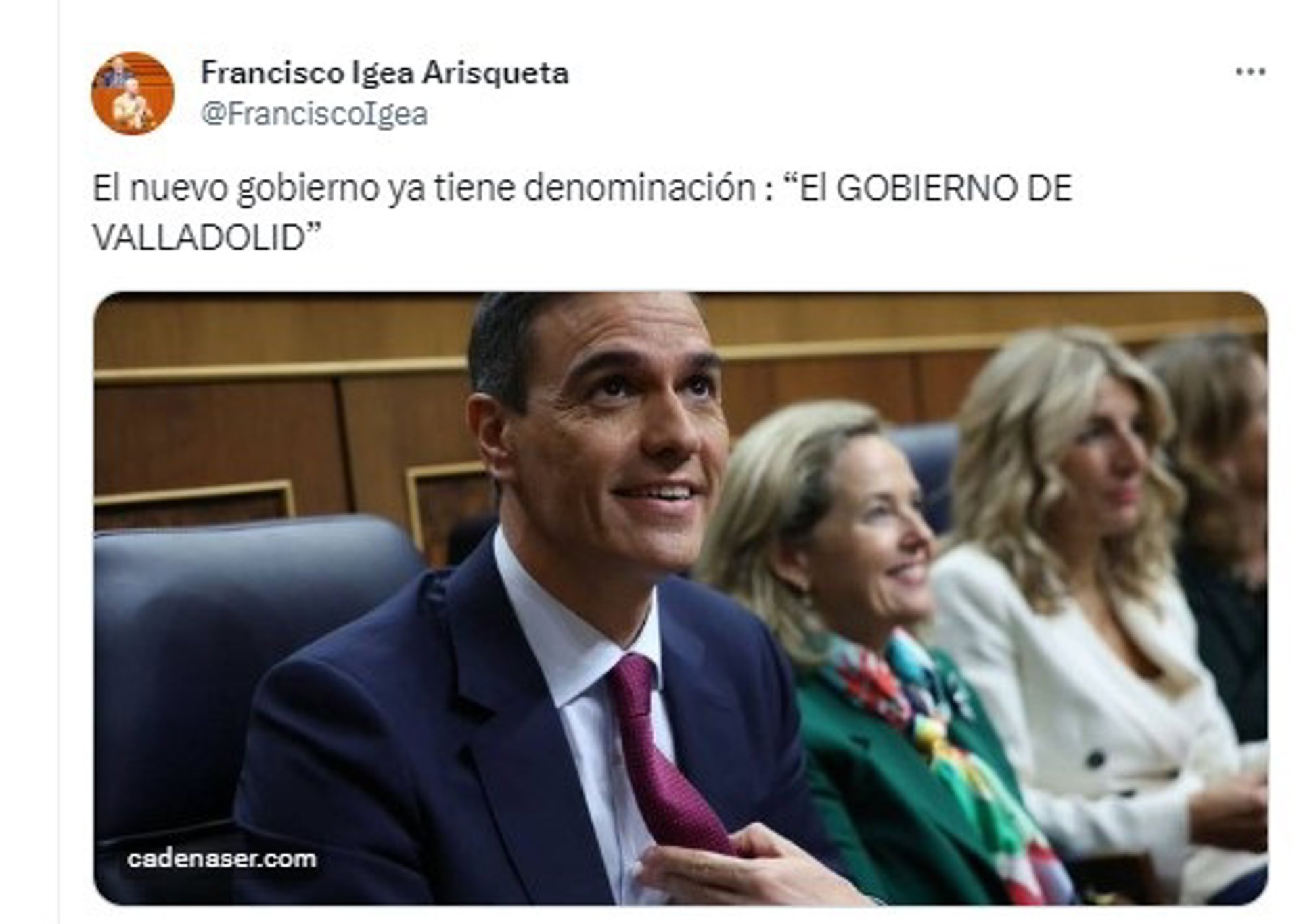 Y en un posterior mensaje publicado en su cuenta personal en 'X' tras conocerse la designación de la vallisoletana Ana Redondo como ministra de Igualdad ha definido al nuevo Ejecutivo como "el Gobierno de Valladolid".