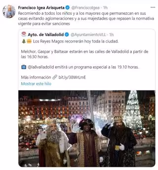 Así lo ha señalado Francisco Igea en su perfil de la red social Twitter en un mensaje en el que citaba otro del Ayuntamiento de Valladolid en el que se informa sobre la llegada de Melchor, Gaspar y Baltasar a la ciudad, con un recorrido que comenzará a las 16.30 horas.