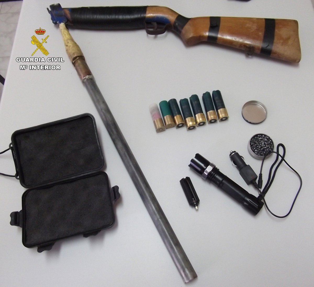 Al inspeccionar el interior del vehículo los Guardias Civiles observan que además del arma arrojada por la ventanilla los imputados portaban 4 cartuchos de postas disparados, del calibre 12; un cartucho de postas sin disparar, del calibre 12; 2 cartuchos de bala sin disparar, del calibre 12, una caja de balines del calibre 4.5, y una linterna adaptada para ser insertada en el arma además de un cargador.