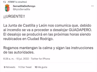 Por su parte y según ha informado el Ayuntamiento de Serradilla del Arroyo en su cuenta de Twitter, la Junta comunió la decisión de desalojar al Consistorio del que depende Guadapero. "El desalojo se producirá en las próximas horas siendo reubicados en Ciudad Rodrigo. Rogamos mantengan la calma y sigan las instrucciones de las autoridades", apuntaba el Ayuntamiento.