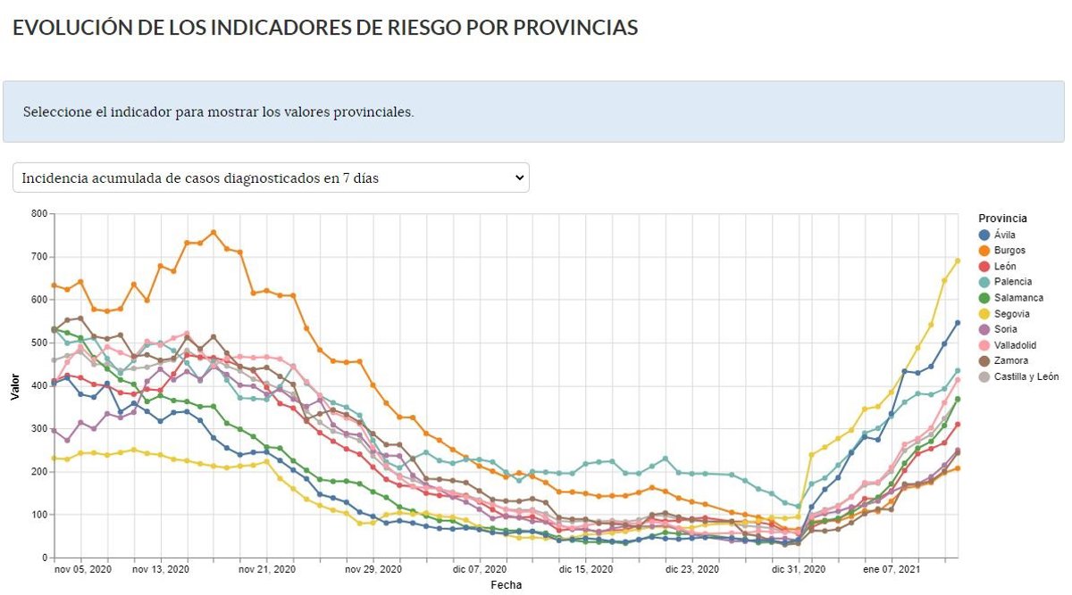De hecho, Segovia que es actualmente la provincia con peores datos de la Comunidad, ya duplica holgadamente su máximo de noviembre en IA a 7 días, mientras que en el indicador a 14 días ha superado los 1.000 casos por cada 100.000 habitantes --1.037--, lo que quiere decir que en las dos últimas semanas se ha contagiado del coronavirus más de uno de cada 100 segovianos.