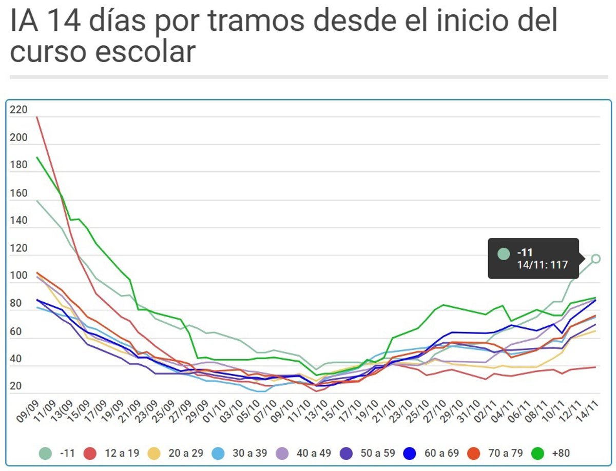 En cualquier caso, la tasa actual, de 117 casos por cada 100.000 habitantes es similar a la que se daba en este grupo al comienzo del actual curso escolar (119 por 100.000 el 14 de septiembre).