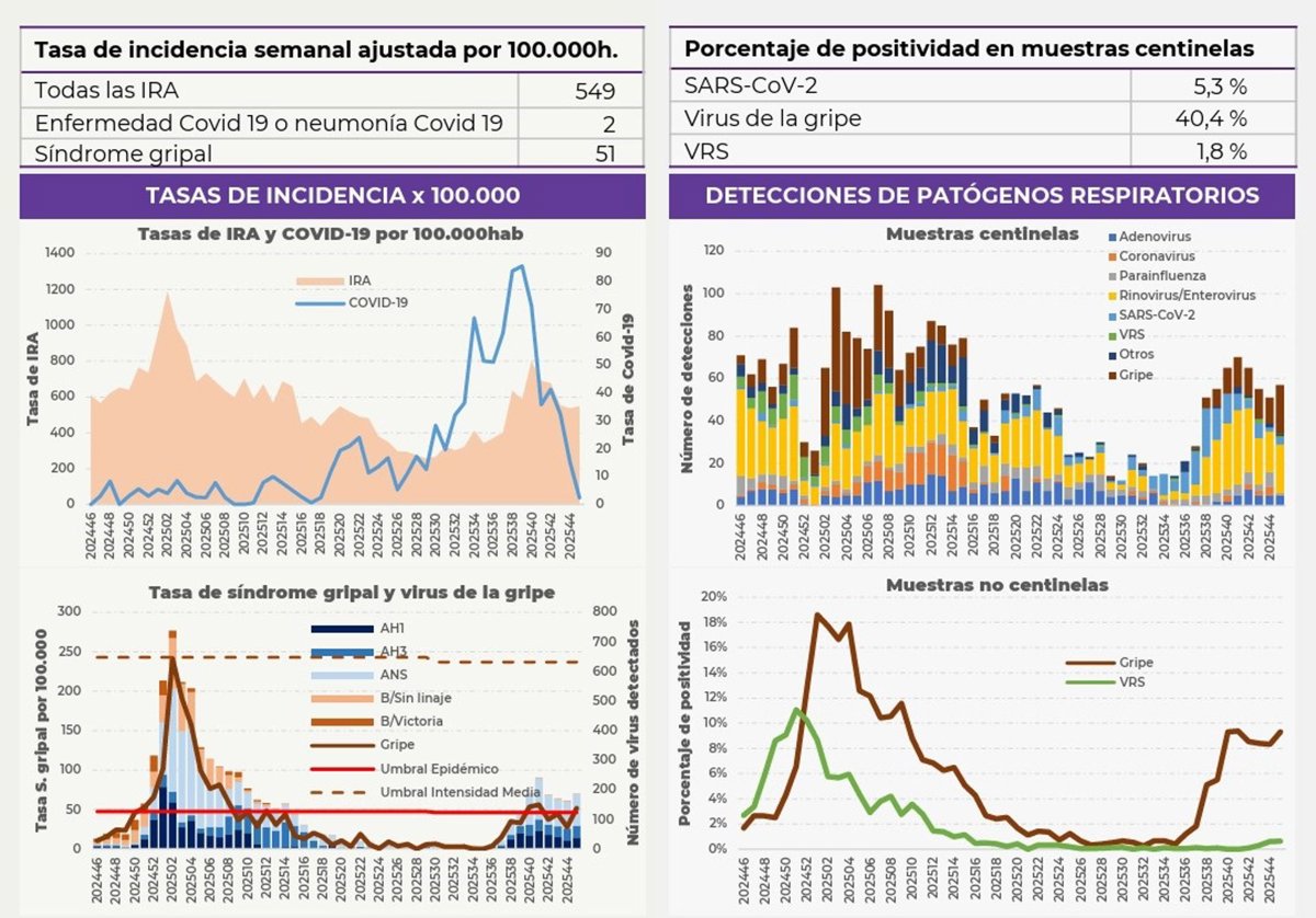 Por último, la tasa de las infecciones respiratorias agudas en su conjunto han pasado de los 501 casos por 100.000 habitantes a los 549 de la semana de estudio.