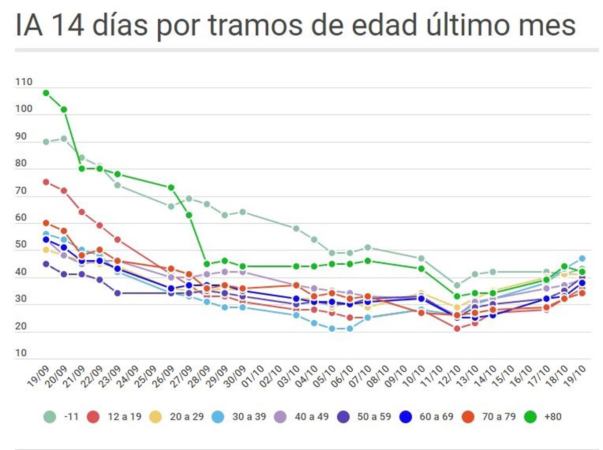 Se trata en todos los tramos de tasas de incidencia acumulada todavía muy contenidas --ninguna supera los 50 casos por 100.000-- pero al venir de niveles muy bajos a principios de la semana del 11 de octubre los incrementos porcentuales parecen abultados.