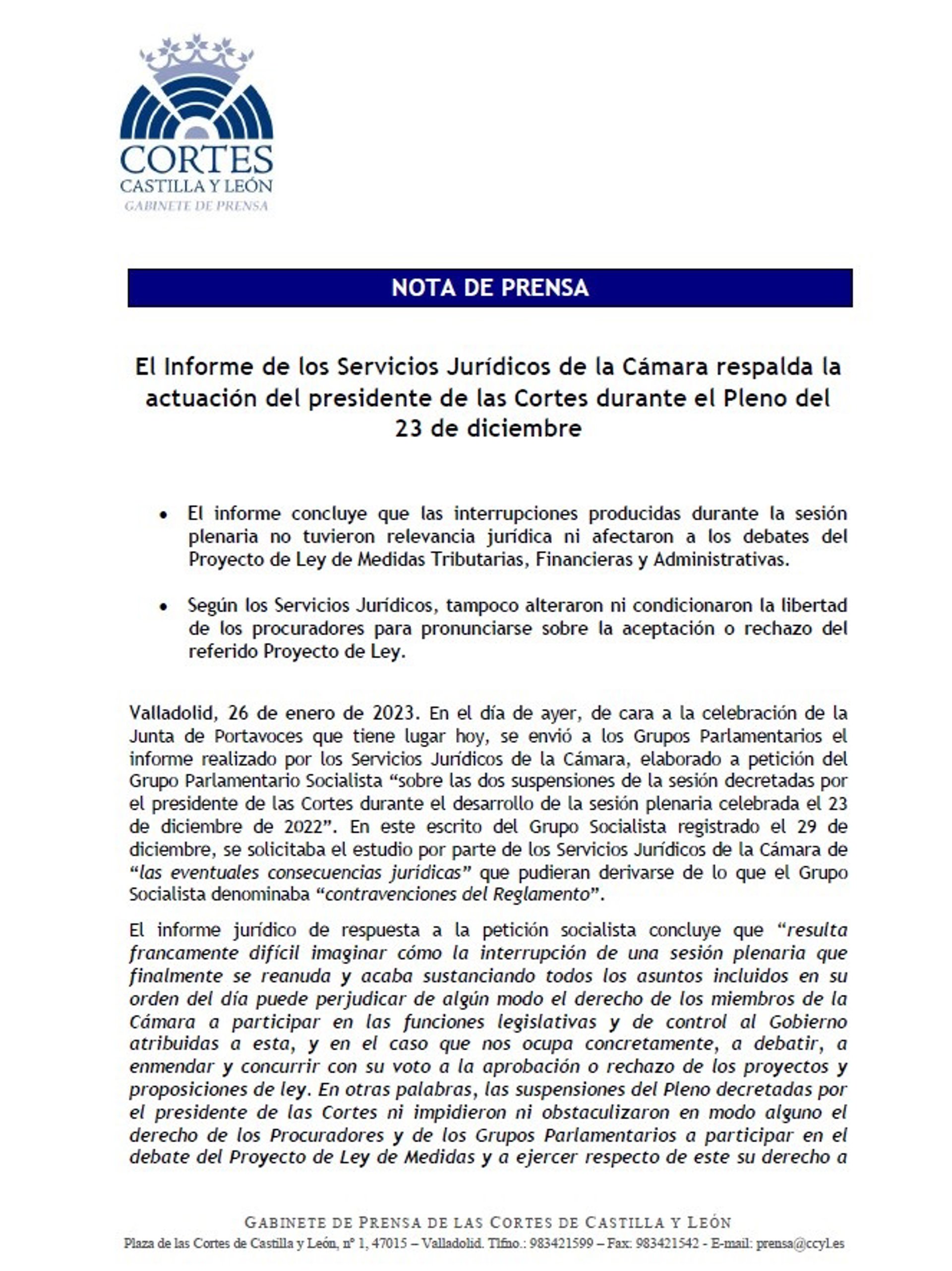 El Informe de los Servicios Jurídicos de las Cortes de Castilla y León ha respaldado la actuación del presidente, Carlos Pollán, en el Pleno del pasado 23 de diciembre y ha concluido que las interrupciones producidas durante la sesión no tuvieron relevancia jurídica ni afectaron a los debates del Proyecto de Ley de Medidas Tributarias, Financieras y Administrativas.