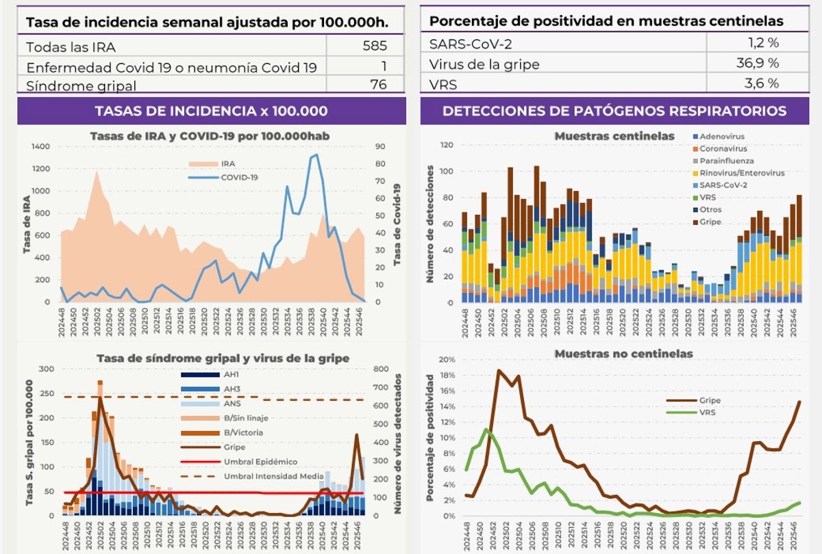 Una hipótesis, añaden desde la Consejería de Sanidad, que se confirmará con la actualización de datos en el próximo informe. La tasa global de incidencia de las Infecciones Respiratorias Agudas (IRA) se mantiene estable, en torno a 600 casos por cada 100.000 habitantes.