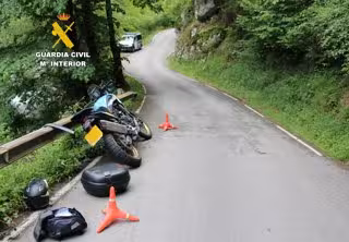 Una de las motocicletas implicadas en el accidente, en el lugar en el que tuvo lugar el suceso, en Posada de Valdeón (León). - GUARDIA CIVIL LEÓN