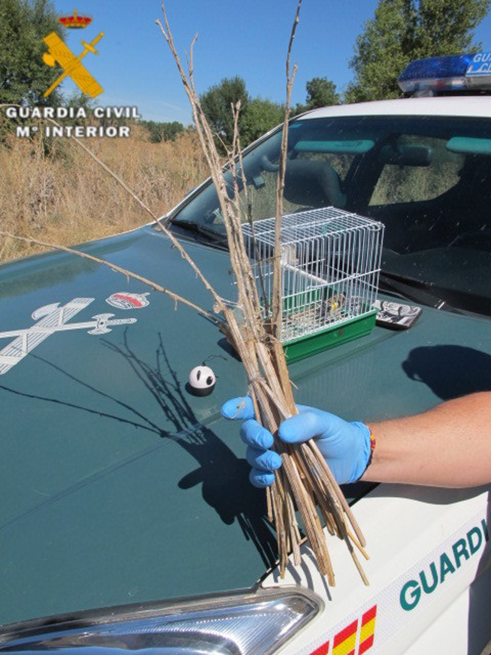 Estaban utilizando varillas impregnadas en liga, una especie de pegamento, instaladas como trampas en diferentes arbustos, a las que acudían los pájaros atraídos por el reclamo sonoro que reproducían los investigados desde sus teléfonos móviles, y que a su vez estaban conectados a un altavoz auxiliar para potenciar el canto de reclamo.