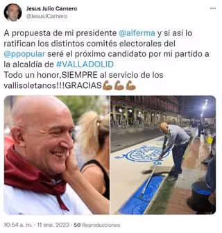 El actual consejero de la Presidencia de la Junta de Castilla y León, Jesús Julio Carnero, ha anunciado en la red social Twitter que, a falta de ratificación por los comités electorales del Partido Popular, será el próximo candidato del PP a la Alcaldía de Valladolid.