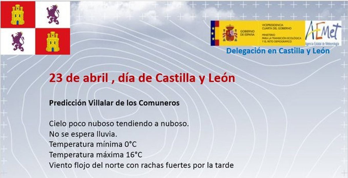 La Agencia Estatal de Meteorología (Aemet) prevé que la jornada de este martes, 23 de abril, en la campa de Villalar de los Comuneros (Valladolid), discurrirá sin lluvias y con temperaturas entre los 0 grados de mínima y los 16 grados de máxima.