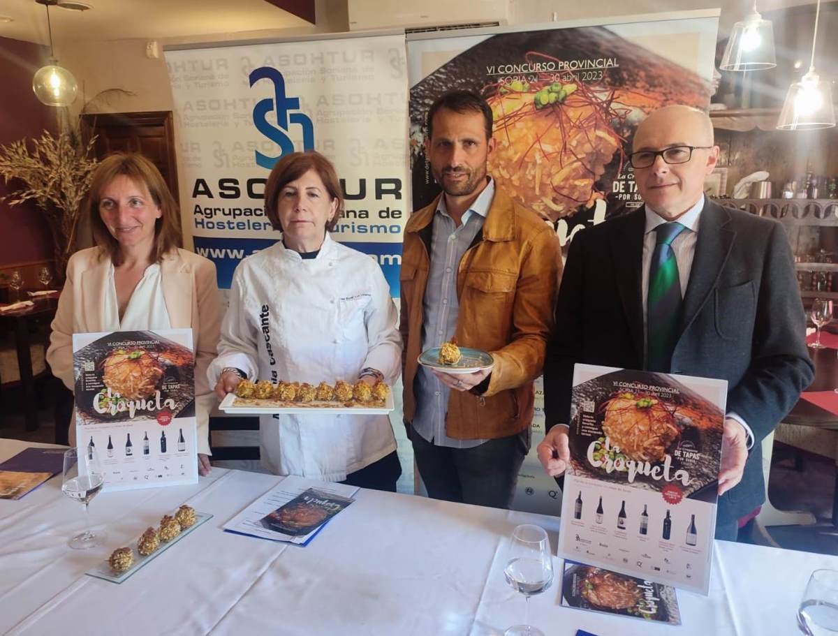 Pablo Cabezón, presidente de Asohtur, ha presentado esta mañana el evento, acompañado por Yolanda Santos, concejal de Comercio y Turismo del Ayuntamiento de Soria; Enrique Rubio, diputado provincial de la Diputación de Soria; Juan Antonio Tierno, director del Área de Empresas de Caja Rural de Soria; y Lourdes Melania Cascante, cocinera y propietaria del Hotel Rural Los Villares (ganadora Mejor Croqueta Provincial 2022).