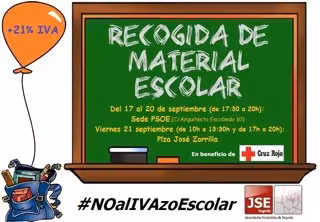 Juventudes Socialistas (JSE) recogerá hasta este jueves en su sede de Segovia y a lo largo del viernes 21 en un acto callejero junto a la Dirección Provincial de Educación material escolar para contrarrestar los efectos de la subida del IVA en familias con más necesidades.