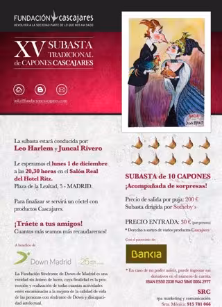 La Fundación Cascajares celebrará este lunes, 1 de diciembre, a las 20.30 horas, la XV edición de la Subasta Tradicional de Capones de Cascajares en el Salón Real del Hotel Ritz de Madrid, cuyos beneficios se destinarán a la Fundación Síndrome de Down de Madrid.