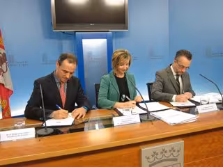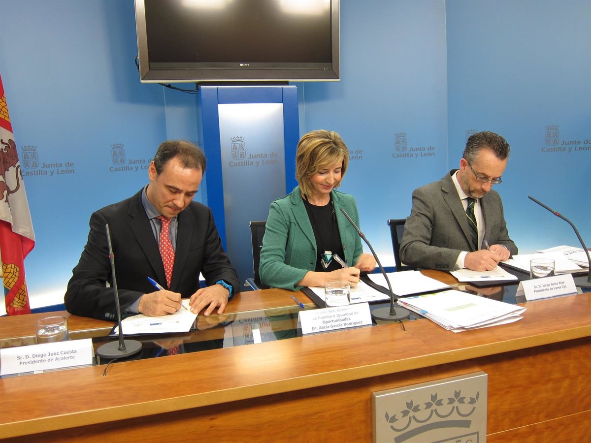 El protocolo de colaboración lo han rubricado la consejera de Familia e Igualdad de Oportunidades, Alicia García, y los presidentes de Acalerte y Lares, Diego Juez y Jorge Sainz, respectivamente.