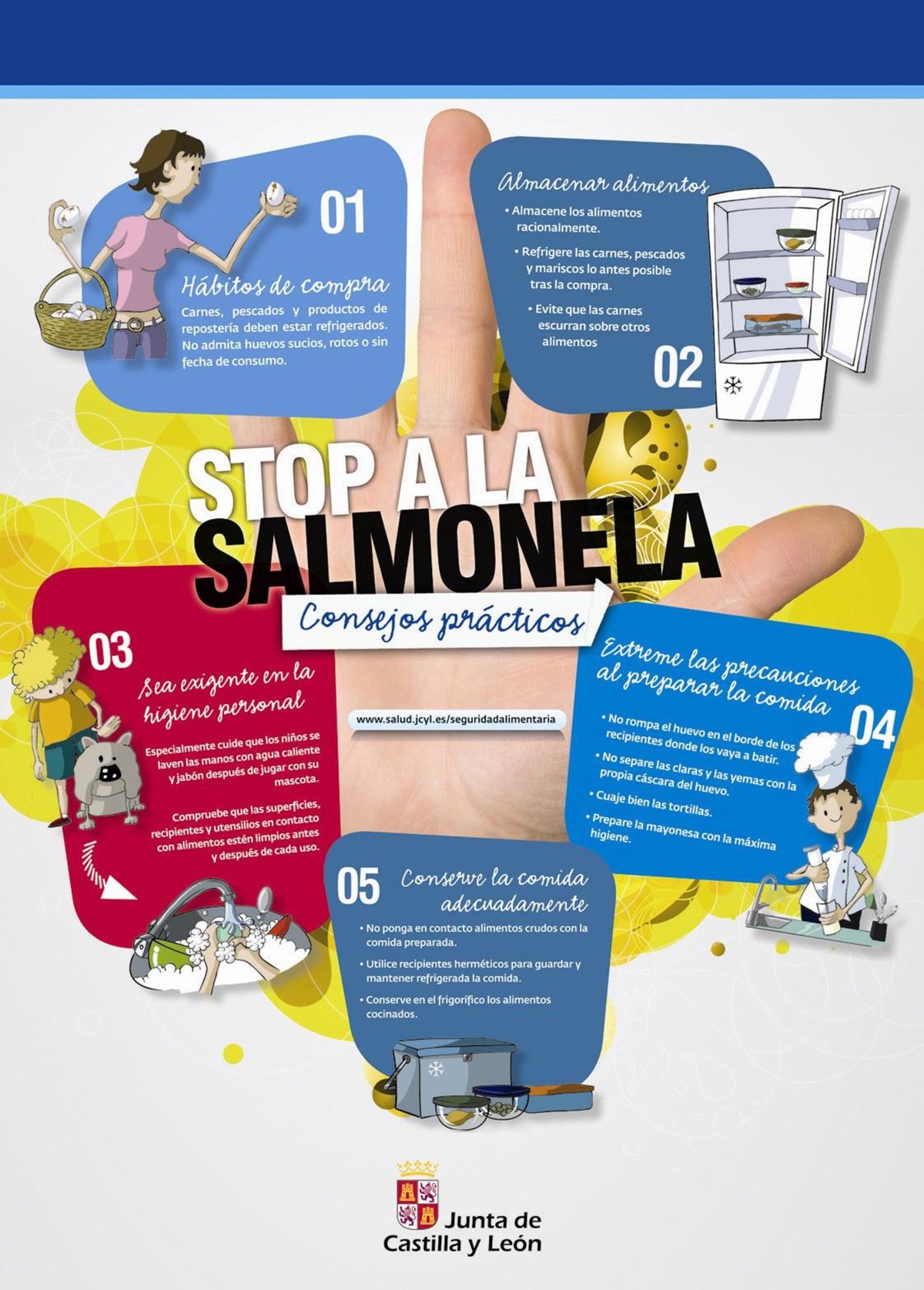 Entre las medidas y los consejos prácticos que se recogen en esos materiales informativos de servicio público figuran los hábitos para la compra, el almacenamiento racional de los alimentos, higiene personal, extremar las precauciones al preparar la comida, conservar la comida preparada adecuadamente y, especialmente, prudencia a la hora de consumir alimentos.