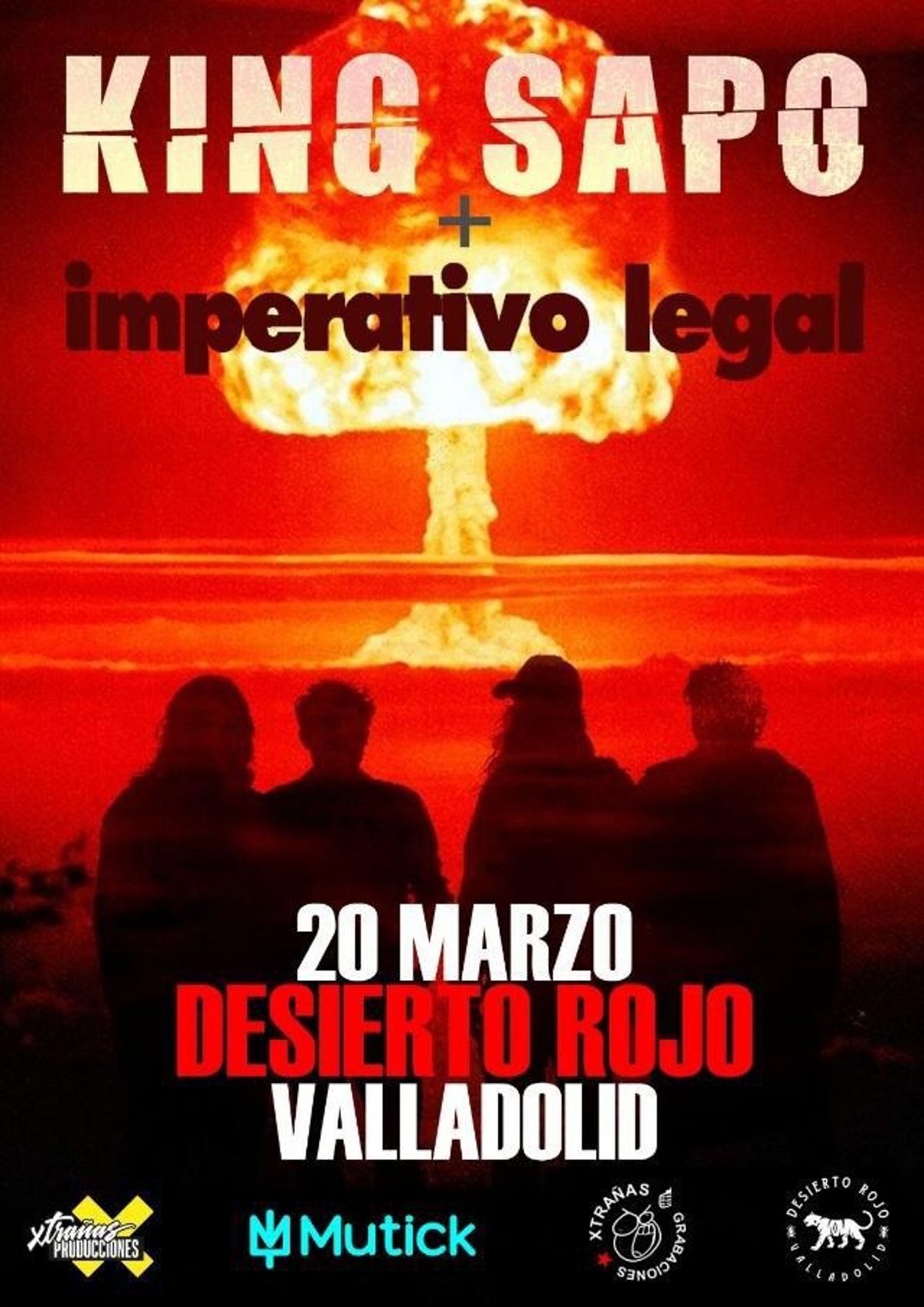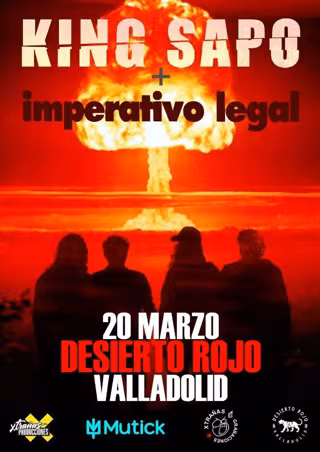 La Sala Desierto Rojo de Valladolid acogerá este viernes, 20 de marzo, una intensa velada de rock con doble protagonismo para recibir a King Sapo e Imperativo Legal, en un concierto que abriá sus puertas a las 20.00 horas. Abrirá el telón, media hora más tarde, la banda vallisoletana Imperativo Legal, seguida, a las 21.20 horas, por los madrileños King Sapo.