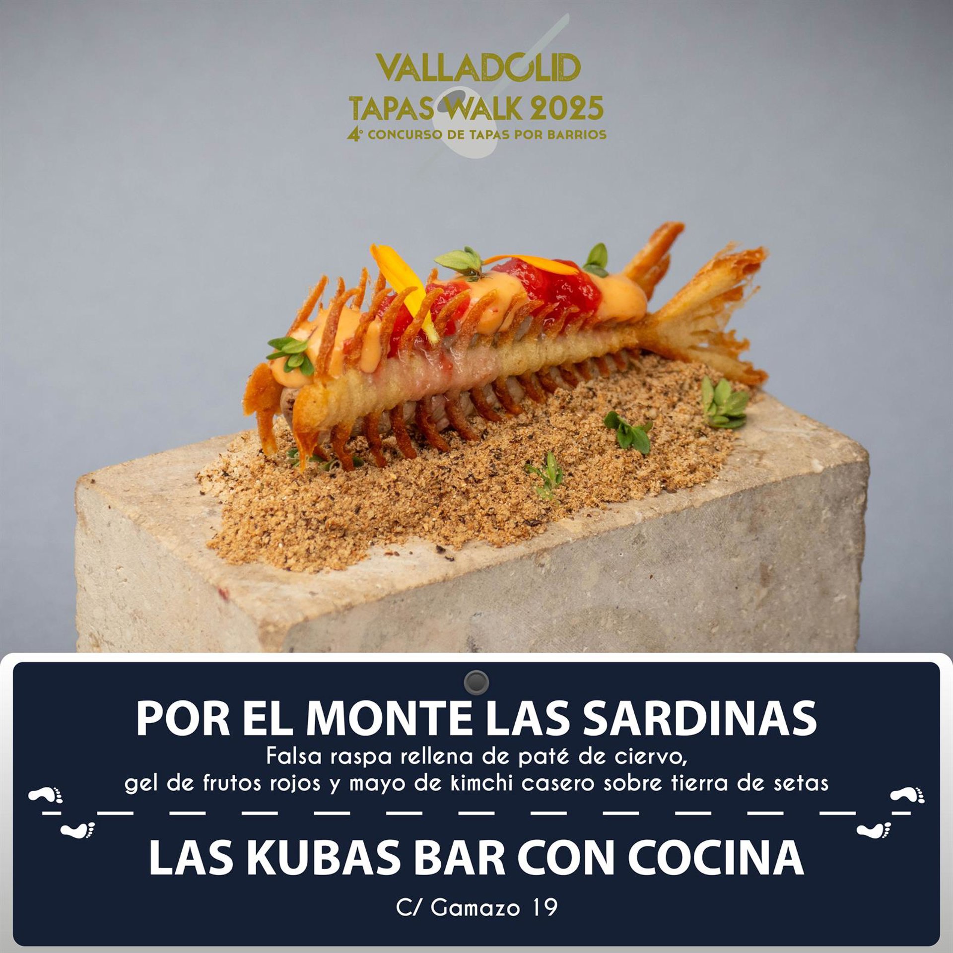 La Kubas Bar, situado en calle Gamazo, 19, ha ganado el cuarto Concurso de Tapas por Barrios 'Valladolid Tapas Walk 2025' con su propuesta 'Por el monte las sardinas', una falsa raspa rellena de pate de ciervo, gel de frutos rojos y mayo de kimchi casero sobre tierra de setas.