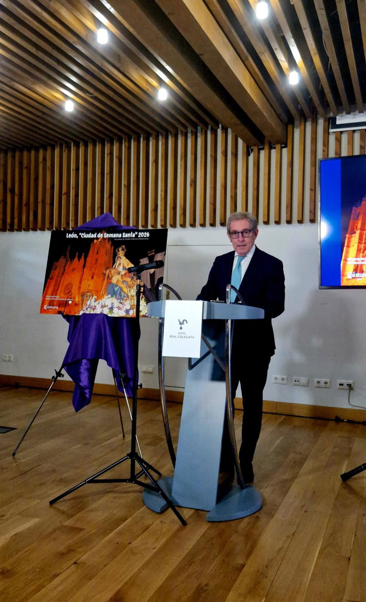 El presidente de la Cámara de Comercio de León, Javier Vega, durante la presentación de la iniciativa León, 'Ciudad de Semana Santa' 2026, en el Hotel Real Colegiata de San Isidoro. - EUROPA PRESS