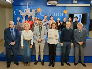 Autores e intérpretes de 'El Tiempo Inventado', junto a representantes de entidades colaboradoras, en la presentación de la obra en Salamanca - EUROPA PRESS