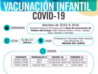 La Junta ha llamado a vacunar, con la segunda dosis, a los niños nacidos entre 2010 y 2016, que pertenecen a las zonas básicas de salud de Peñafiel, el 8 de febrero; Medina del Campo, del 9 al 11 de febrero, y en Medina de Rioseco, el 10 de febrero.