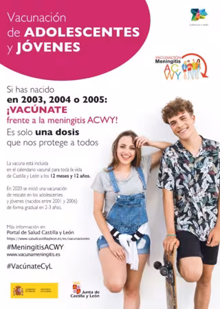 Sacyl ha llamado a vacunarse frente al meningococo ACWY a adolescentes y jóvenes nacidos entre los años 2003, 2004 y 2005, que está incluida desde enero de 2019 en el Calendario Vacunal para toda la vida de Castilla y León.