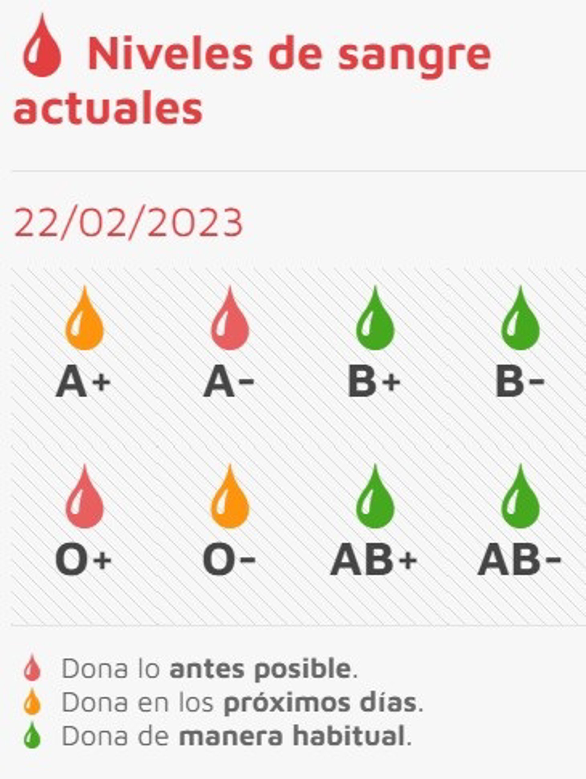 Por su parte, los tipos A+ y 0- están en naranja, por lo que se llama a donar "en los próximos días", mientras que el resto de grupos, B+, B-, AB+ y AB-, se encuentran en nivel verde.