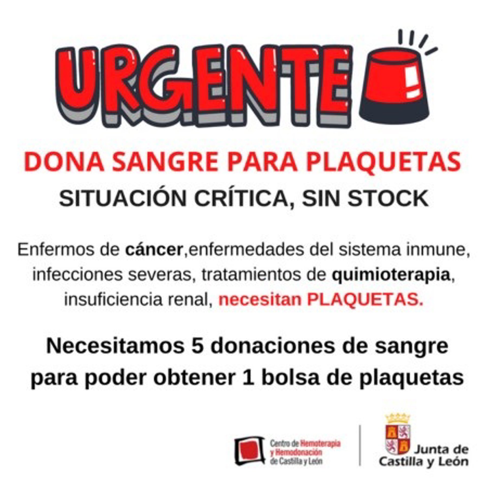 "Se necesitan urgentemente donaciones de sangre para tener plaquetas suficientes para nuestros enfermos", explica el Centro de Hemoterapia y Hemodonación en Castilla y León en un mensaje de urgencia publicado en las redes sociales.