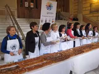 Varios centenares de ciudadanos han esperado hasta las 19.00 horas en las proximidades del Consistorio para degustar un dulce que estará a la venta en las confiterías de la ciudad hasta el domingo 21 de mayo. La corona está compuesta por un roscón de bollería hojaldrada enriquecida, salpicado con almendras fileteadas, relleno con cabello de ángel y pasta de almendra, ha explicado Del Caño para aclarar que en los establecimientos se dispensará con "diferentes variaciones en el relleno" como nata, crema o chocolate.