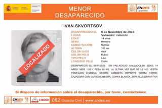 El Centro Nacional de Desaparecidos ha informado este viernes de que ha sido localizado el menor de 14 años, llamado Ivan Skvortsov, al que se buscaba en Valladolid desde el pasado lunes 6 de noviembre.