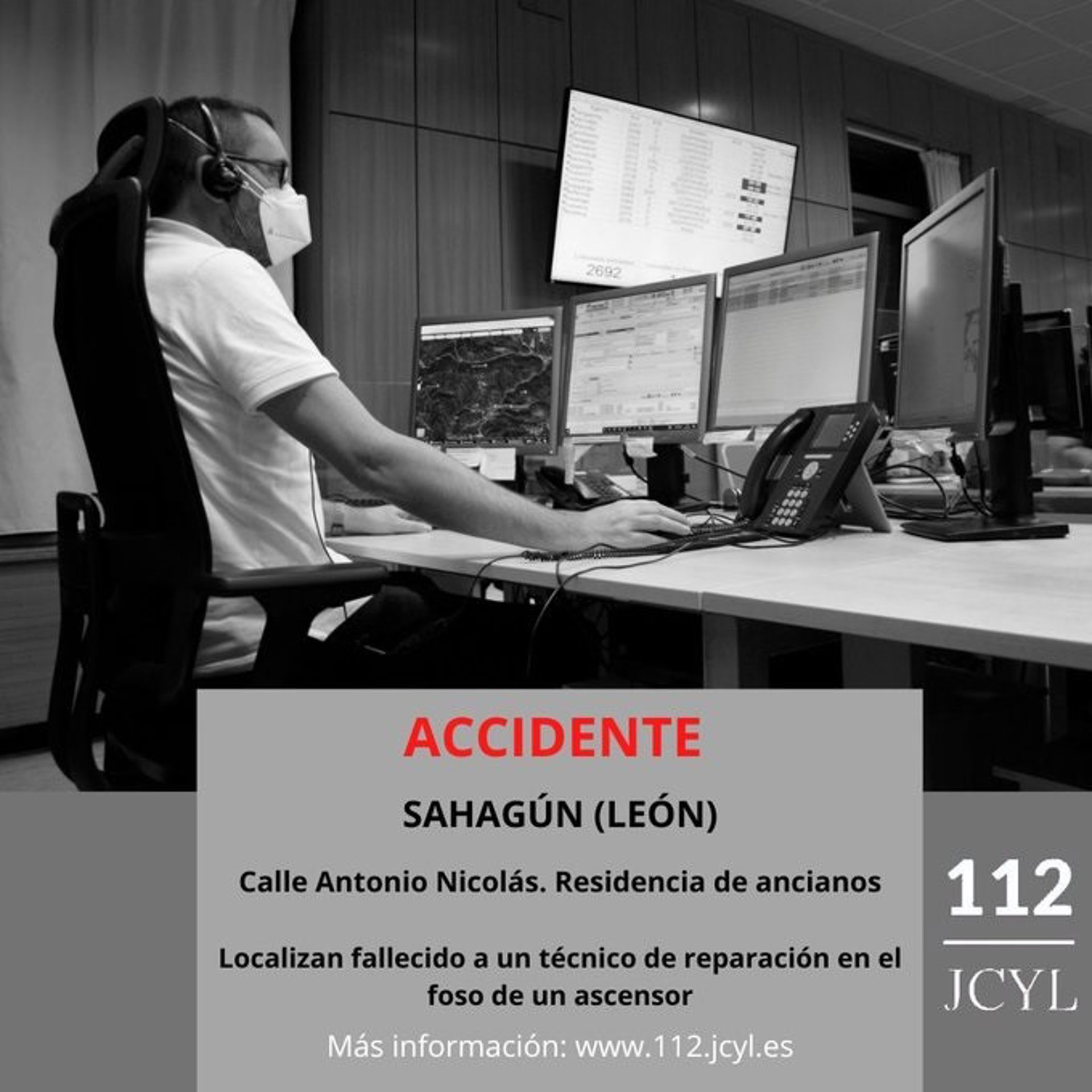 Según precisan las mismas fuentes, a las 01.24 horas de este martes, 19 de julio, la sala de operaciones del Centro de Emergencias 1-1-2 Castilla y León recibió una llamada de una residencia de ancianos situada en la calle Antonio Nicolás de Sahagún para informar de la desaparición de un técnico de reparación de ascensores que se hallaba trabajando en uno de los elevadores de la residencia y al que no conseguían localizar.