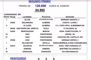El sorteo de Lotería Nacional de este sábado, 11 de mayo, ha dejado parte de un segundo premio, que ha repartido 120.000 euros y ha recaído en el número 04.985, en Zamora capital y en la localidad abulense de San Pedro del Arroyo.