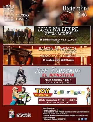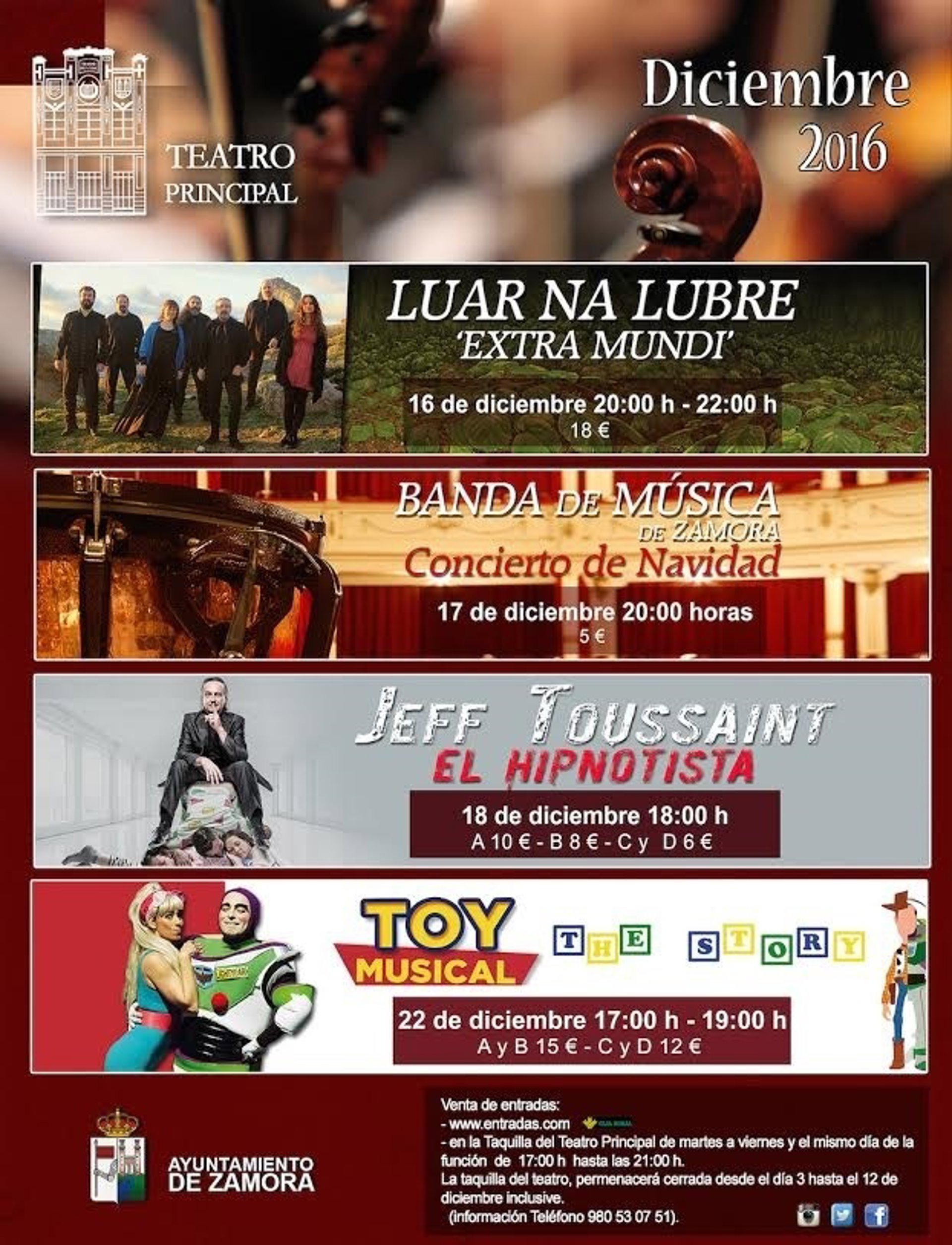 El Teatro Principal de Zamora retomará su programación el viernes 16 de diciembre con el doble concierto de la agrupación gallega Luar Na Lubre, referente de la música celta, que presentará su último disco 'Extra mundi', en el que se reinterpretan y versionan temas clásicos como el Txoria Txori vasco, La Muixeranga valenciana o la Fisterra gallega.